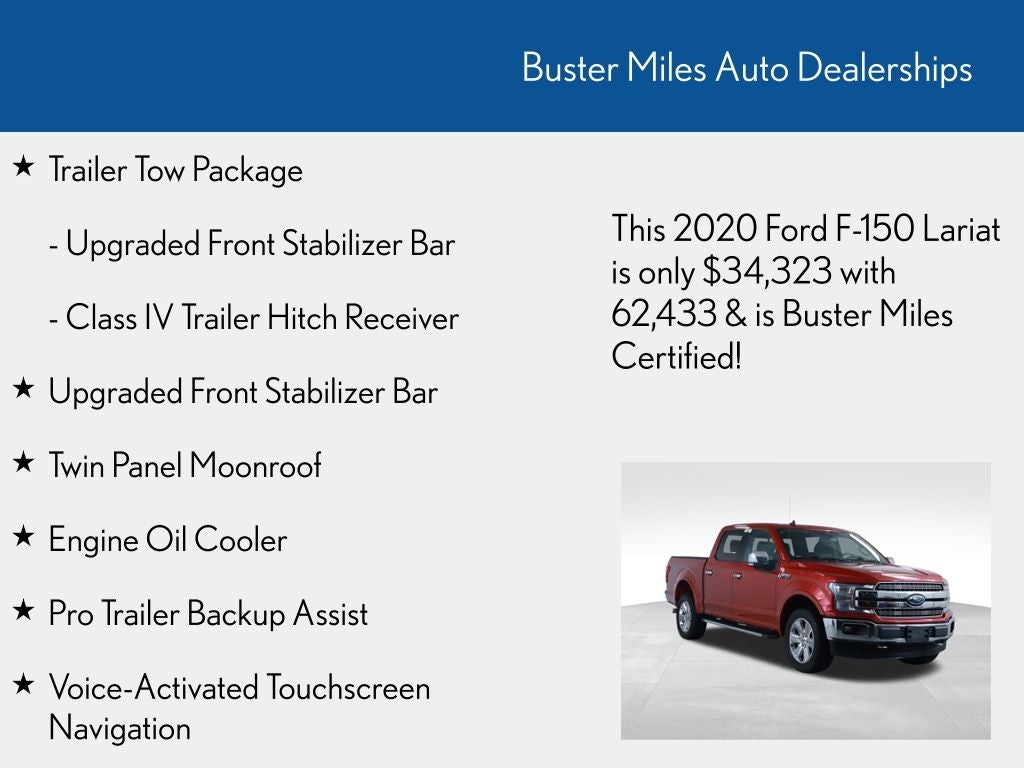 Whether you're hauling heavy loads, towing a trailer, or simply enjoying the open road, this 2020 Ford F-150 Lariat is the perfect companion. Experience the power, capability, and luxury that make this truck a true standout in its class.