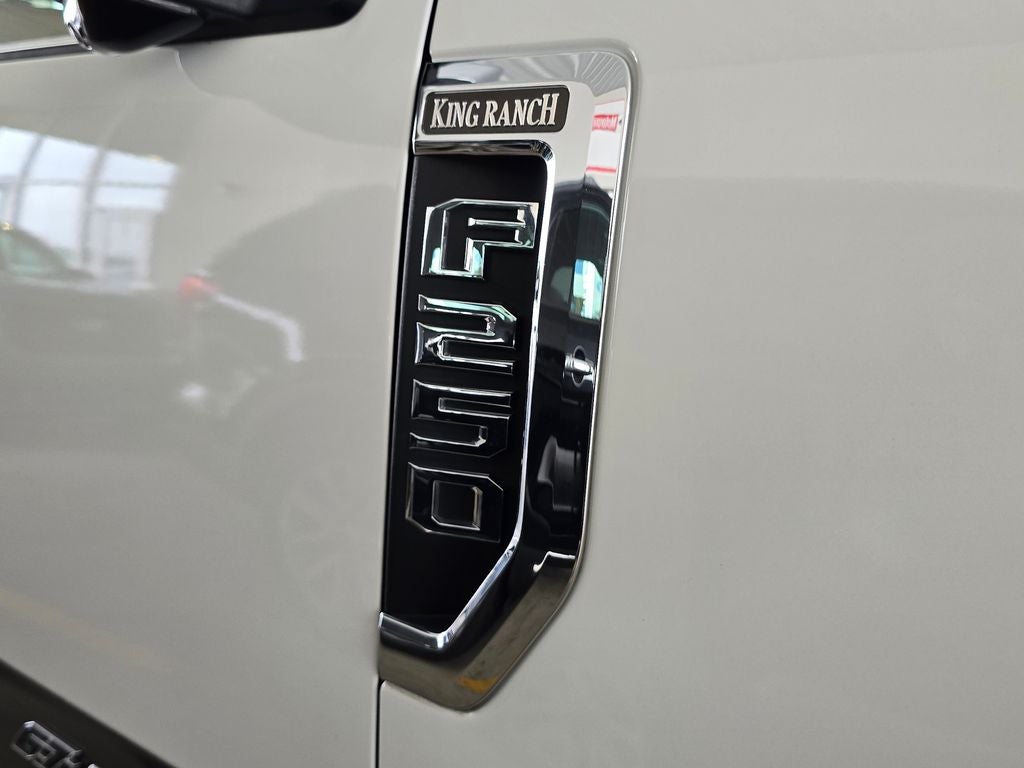 The King Ranch Ultimate Package elevates this F-250SD with premium features like a twin-panel power moonroof, multi-contour seats, and power-deployable running boards. The Chrome Package adds a distinctive touch with chrome front and rear bumpers, 18-inch chrome wheels, and unique chrome mirror caps.